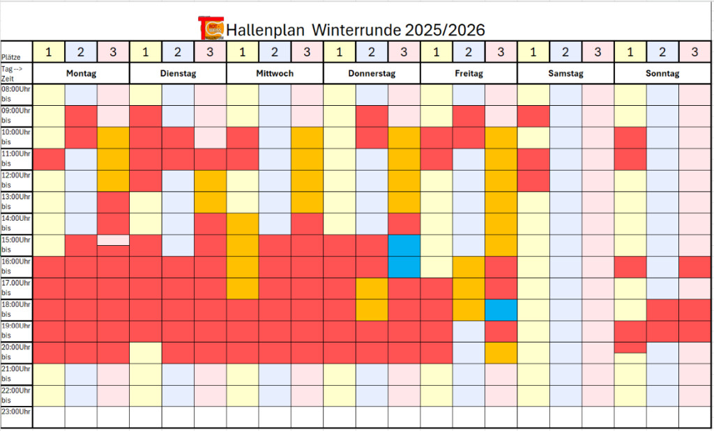 Hallenplan 2025/2026: Rot: besetzt, Orange: von Trainerteam besetzt, blau: besetzt von Jugend